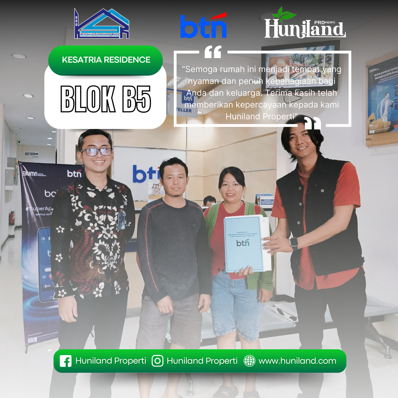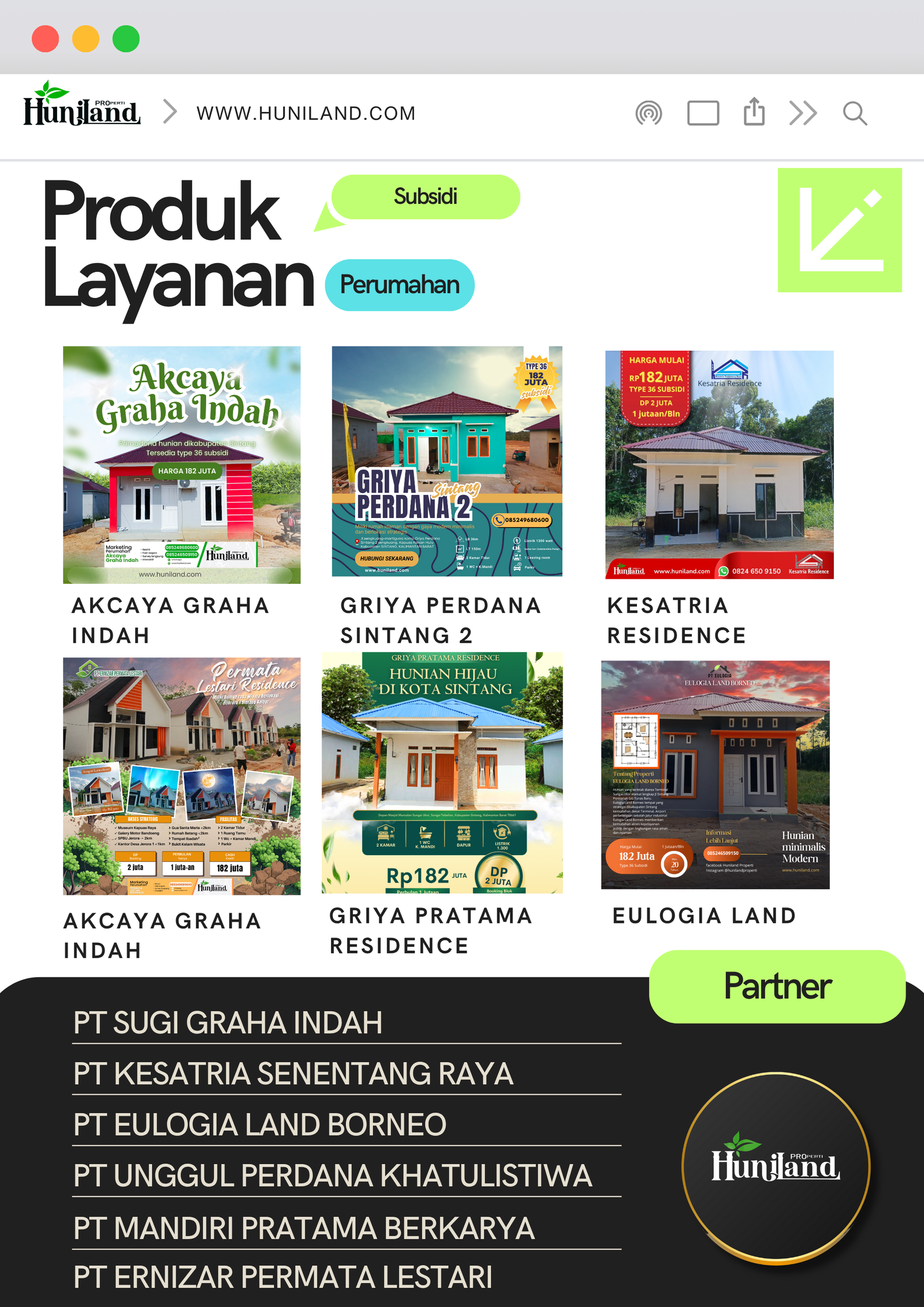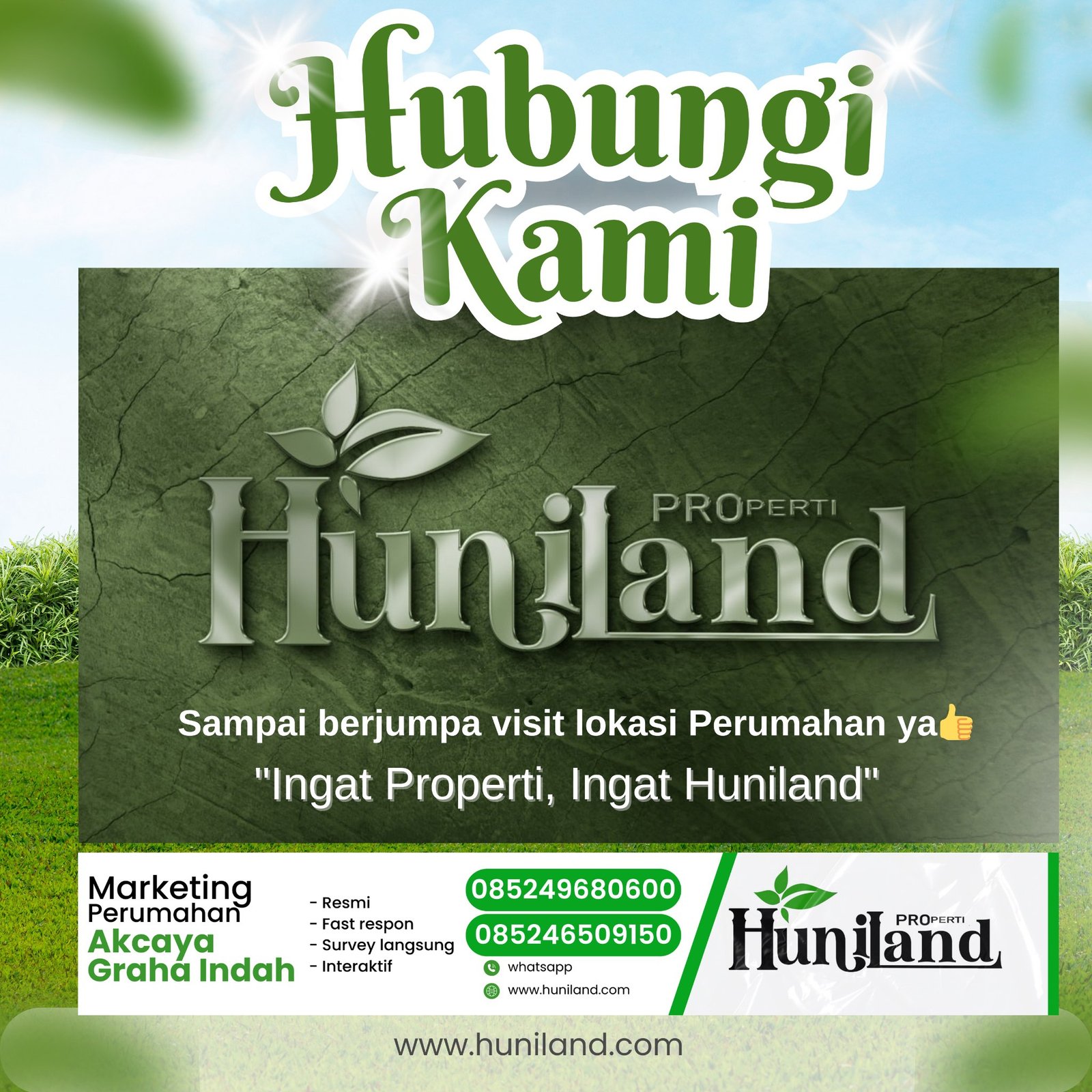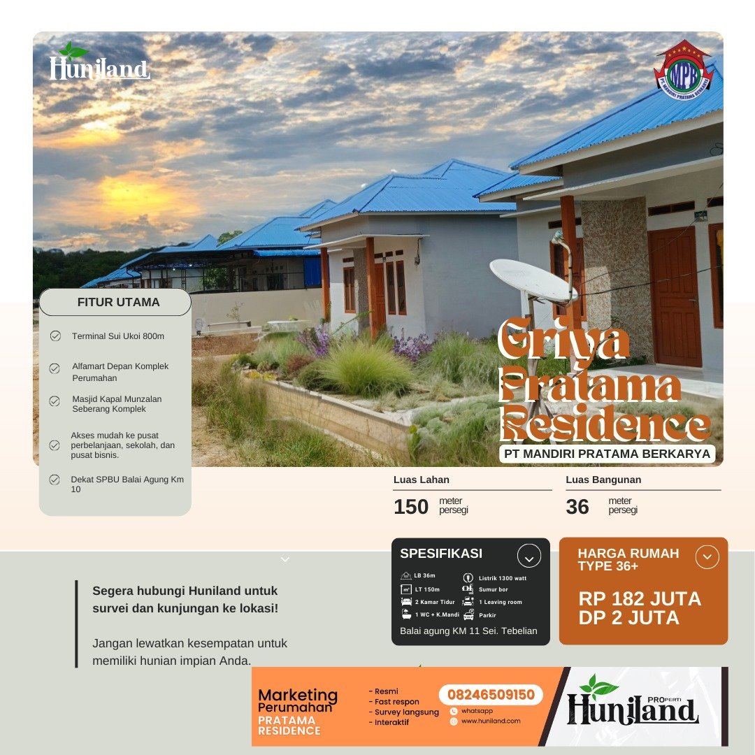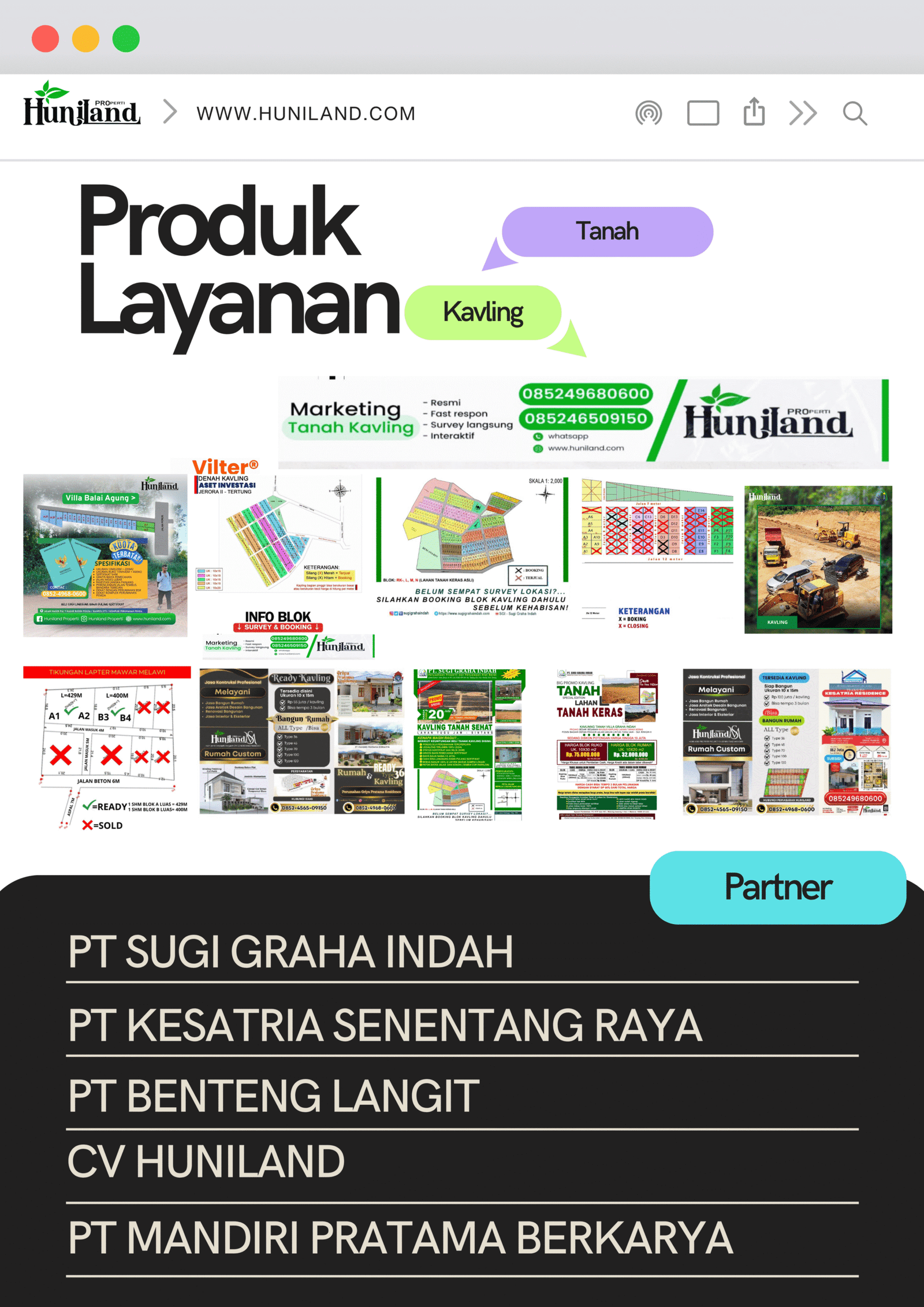 Huniland Properti memahami arti rumah dan kavling yang berkualitas. Kami menawarkan properti dengan cermat dan lokasi yang strategis, menjadi investasi berharga untuk masa depan Anda, menawarkan pelayanan terbaik kepada Anda. Kemitraan kami bukan hanya tentang menjual properti “ini tentang memberikan pengalaman dan Kwalitas tanpa kompromi”..,