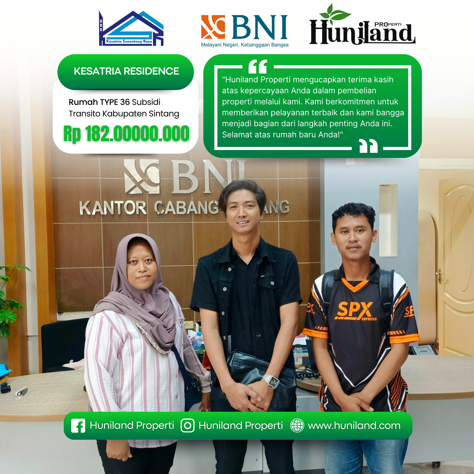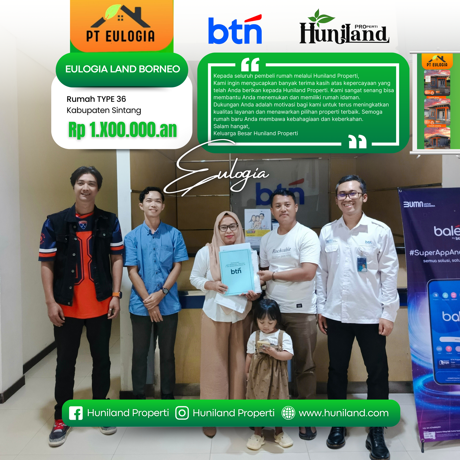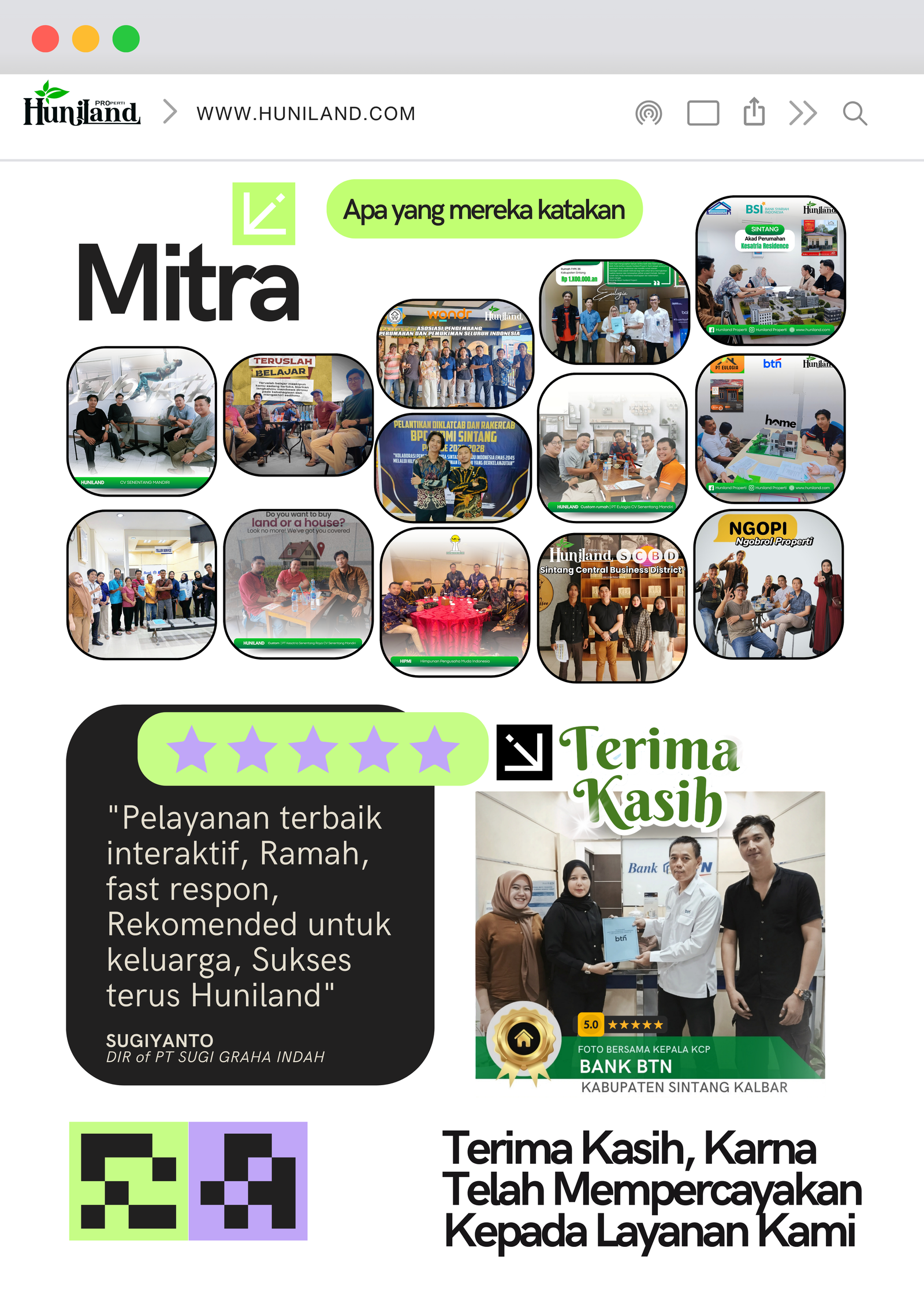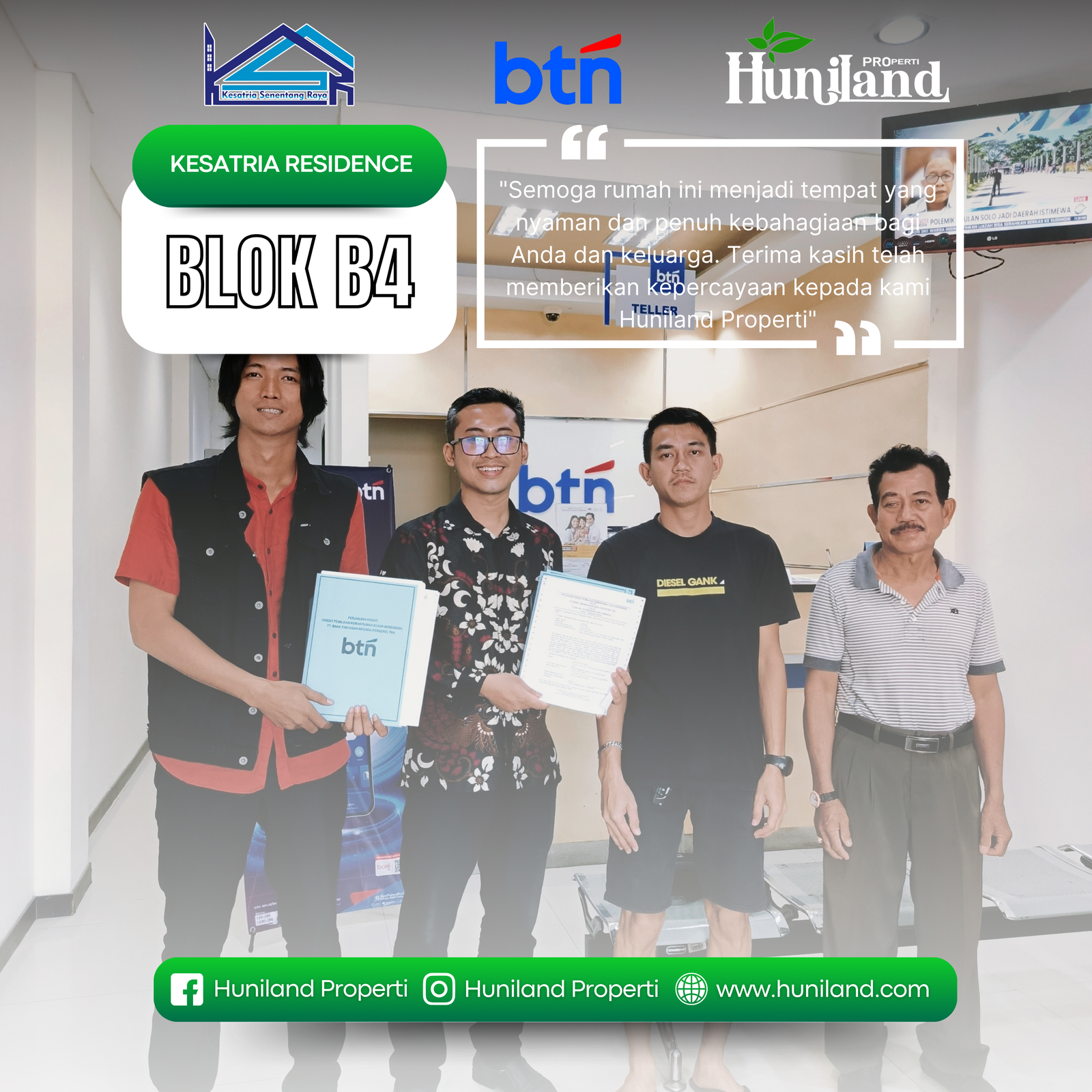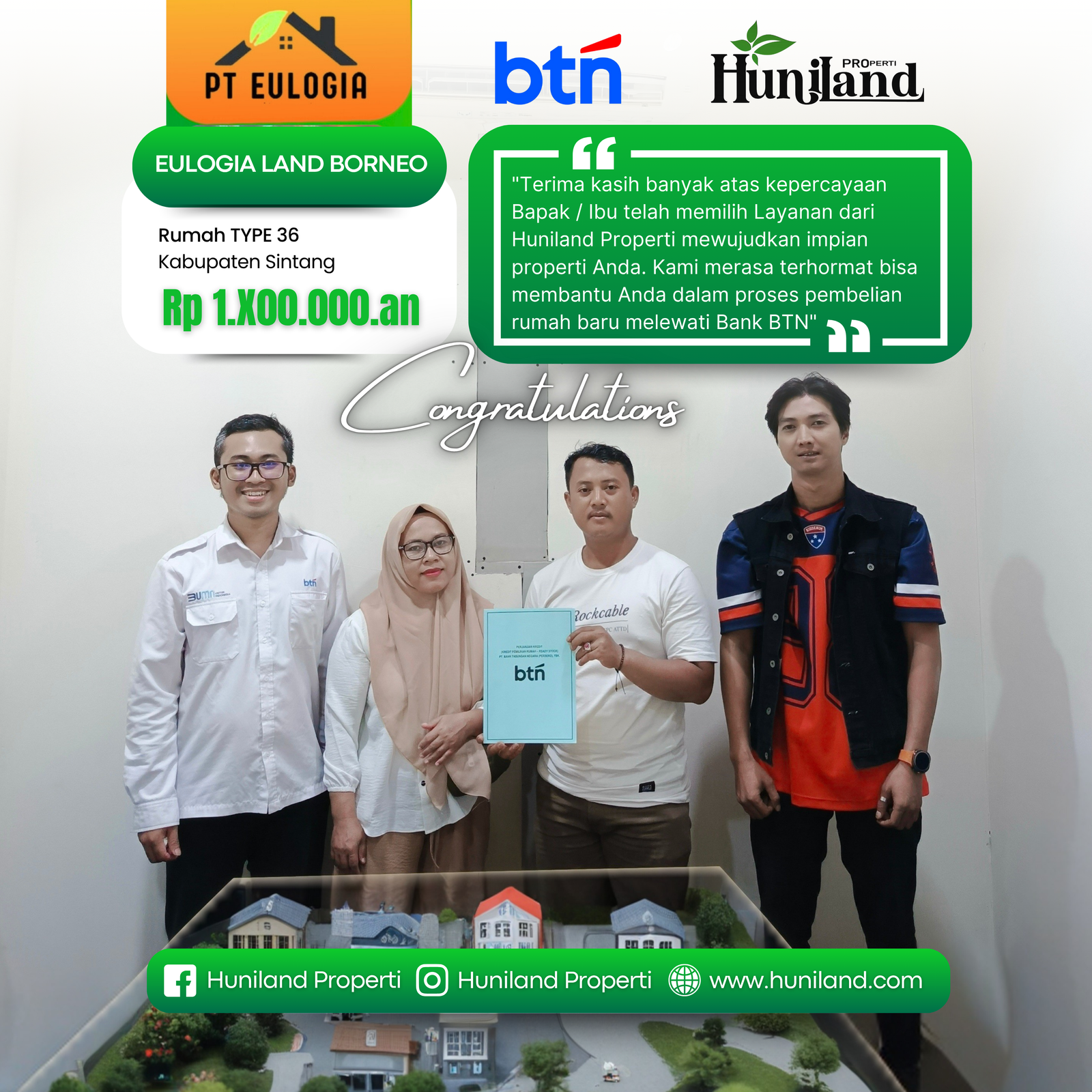 Huniland Properti memahami arti rumah dan kavling yang berkualitas. Kami menawarkan properti dengan cermat dan lokasi yang strategis, menjadi investasi berharga untuk masa depan Anda, menawarkan pelayanan terbaik kepada Anda. Kemitraan kami bukan hanya tentang menjual properti “ini tentang memberikan pengalaman dan Kwalitas tanpa kompromi”..,