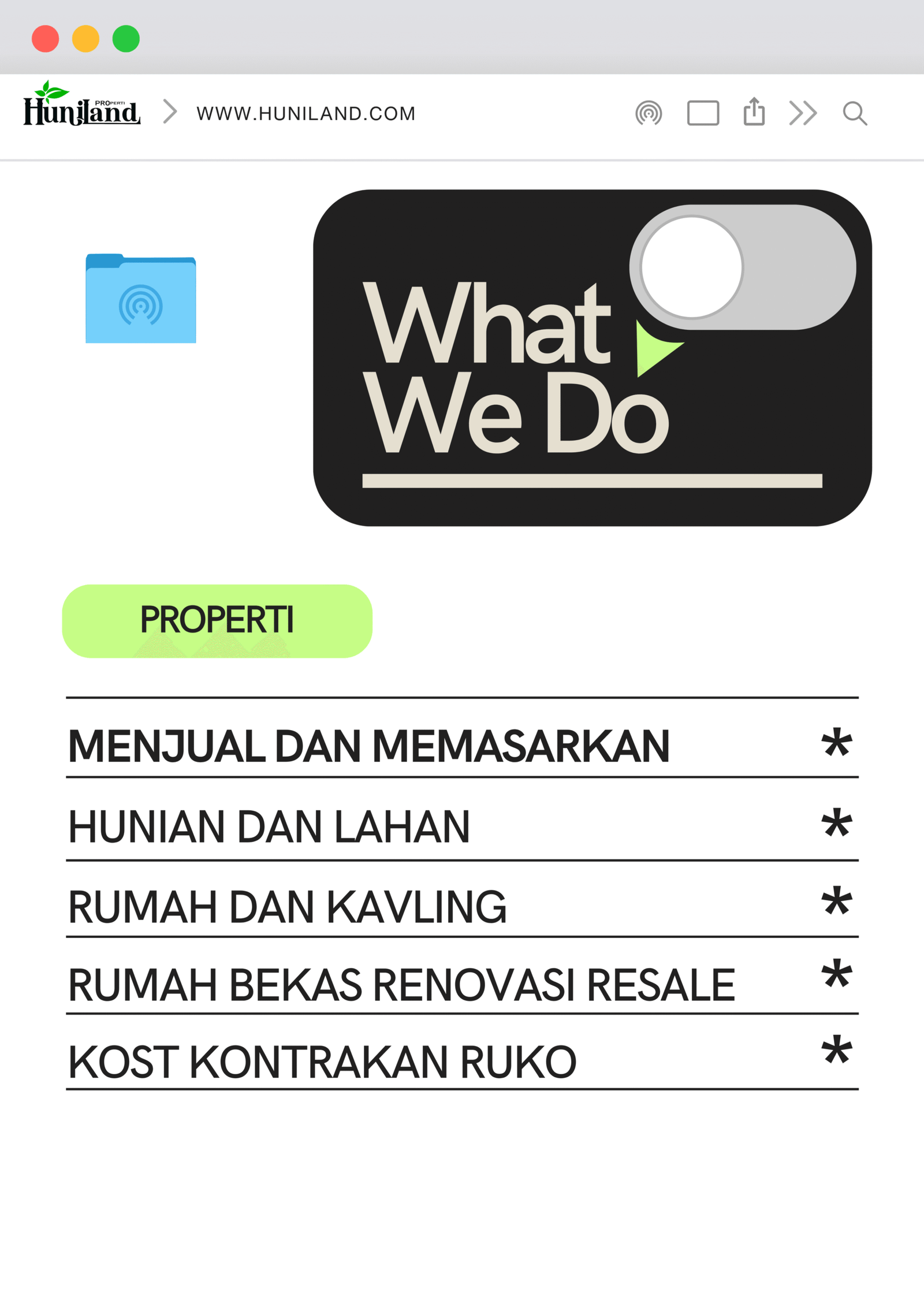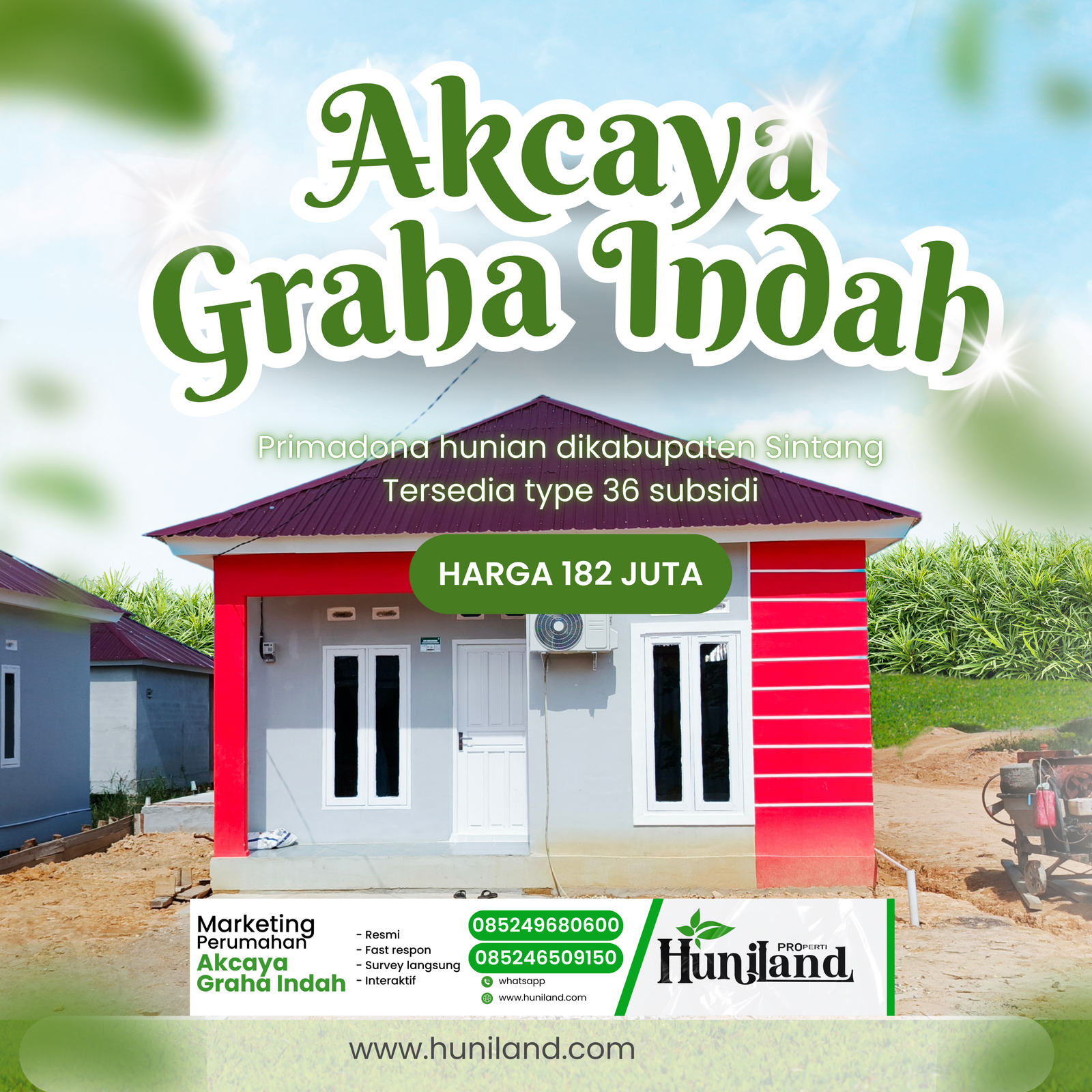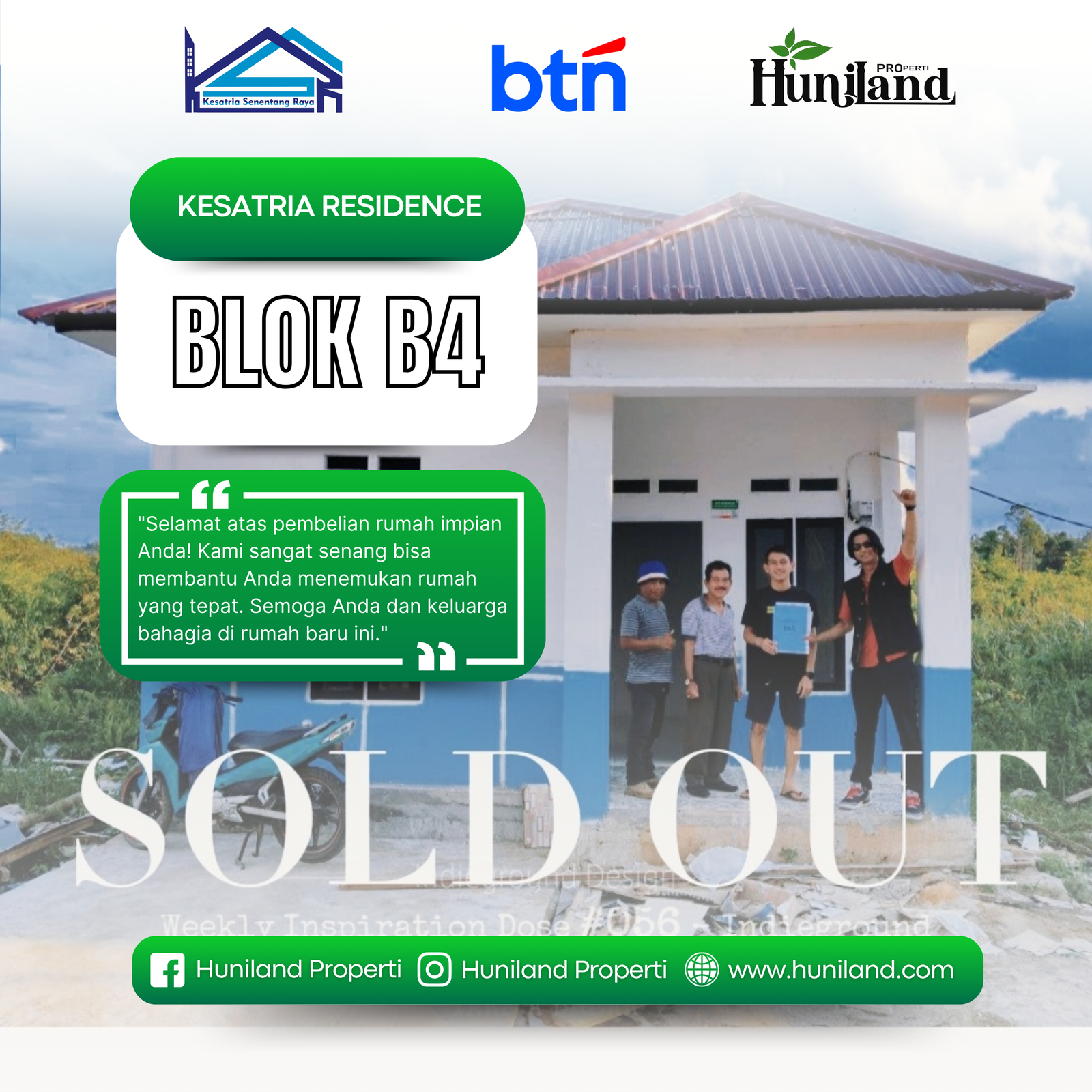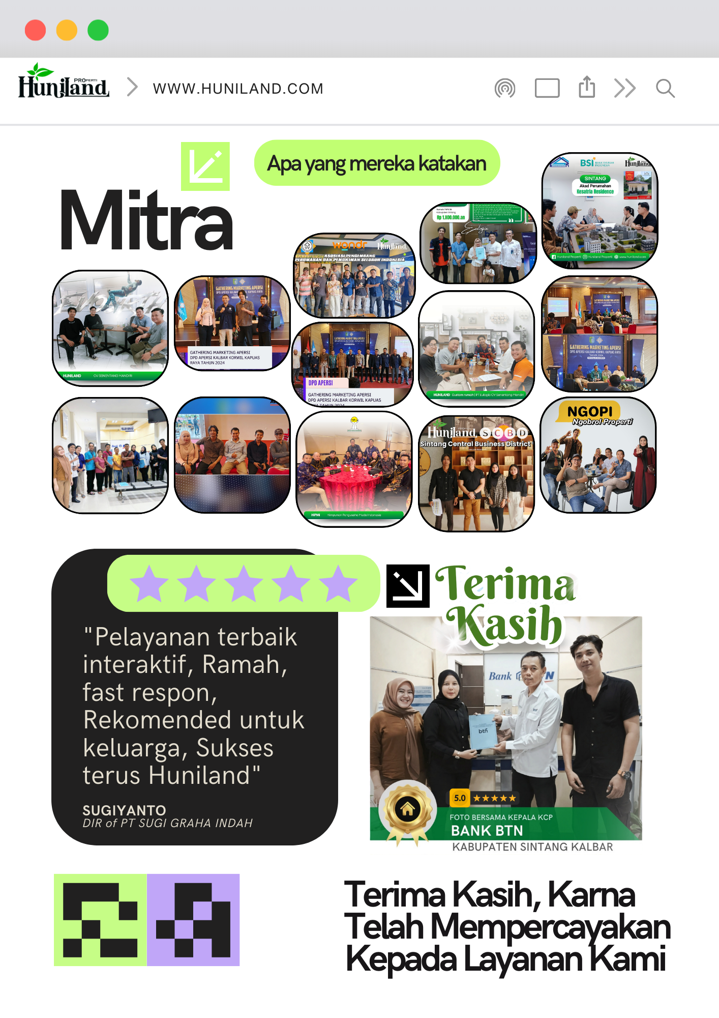 Huniland Properti memahami arti rumah dan kavling yang berkualitas. Kami menawarkan properti dengan cermat dan lokasi yang strategis, menjadi investasi berharga untuk masa depan Anda, menawarkan pelayanan terbaik kepada Anda. Kemitraan kami bukan hanya tentang menjual properti “ini tentang memberikan pengalaman dan Kwalitas tanpa kompromi”..,