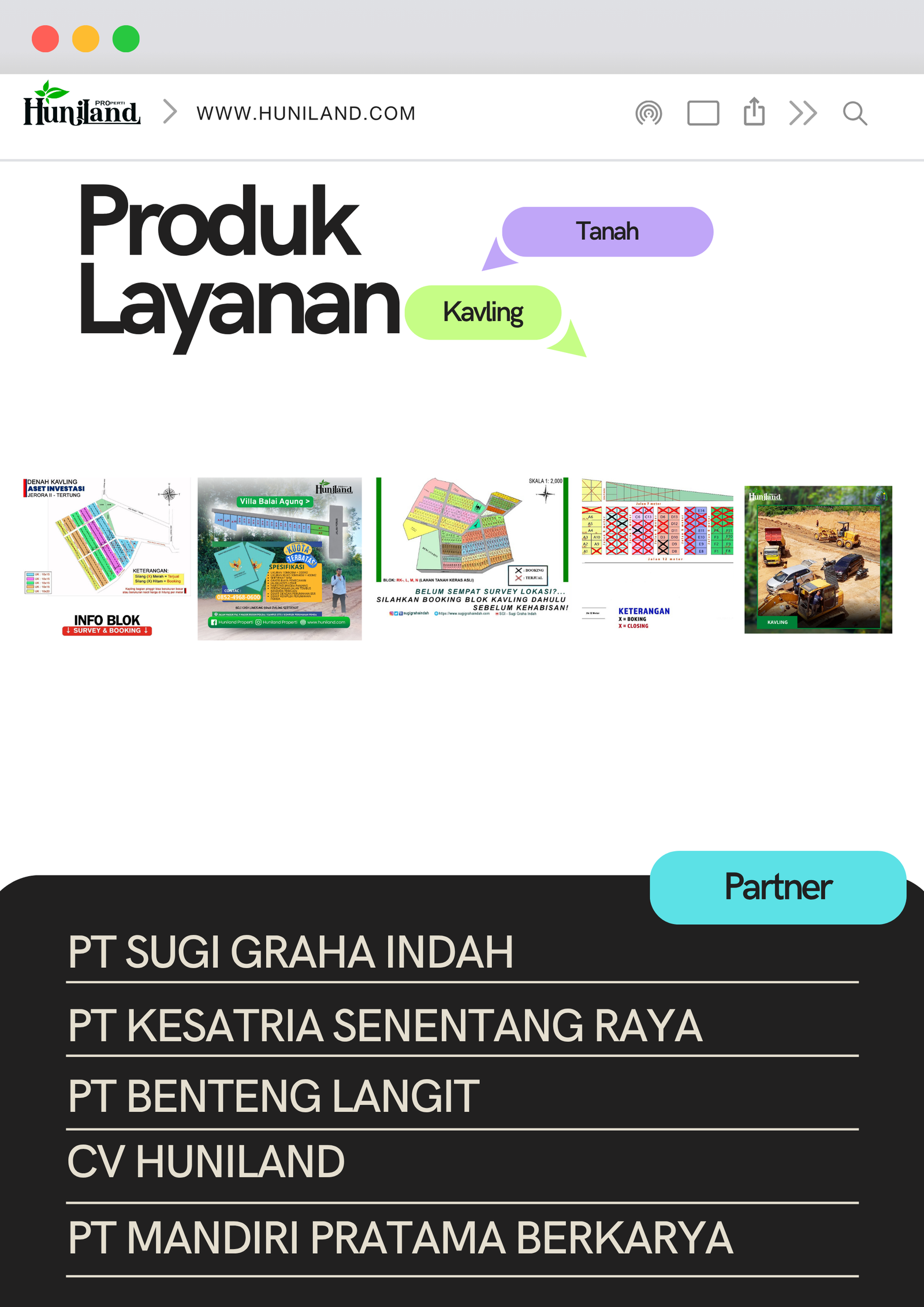 Huniland Properti memahami arti rumah dan kavling yang berkualitas. Kami menawarkan properti dengan cermat dan lokasi yang strategis, menjadi investasi berharga untuk masa depan Anda, menawarkan pelayanan terbaik kepada Anda. Kemitraan kami bukan hanya tentang menjual properti “ini tentang memberikan pengalaman dan Kwalitas tanpa kompromi”..,